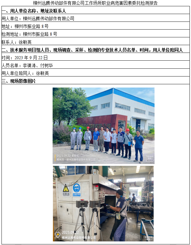 柳州遠(yuǎn)騰傳動(dòng)部件有限公司工作場(chǎng)所職業(yè)病危害因素委托檢測(cè)報(bào)告